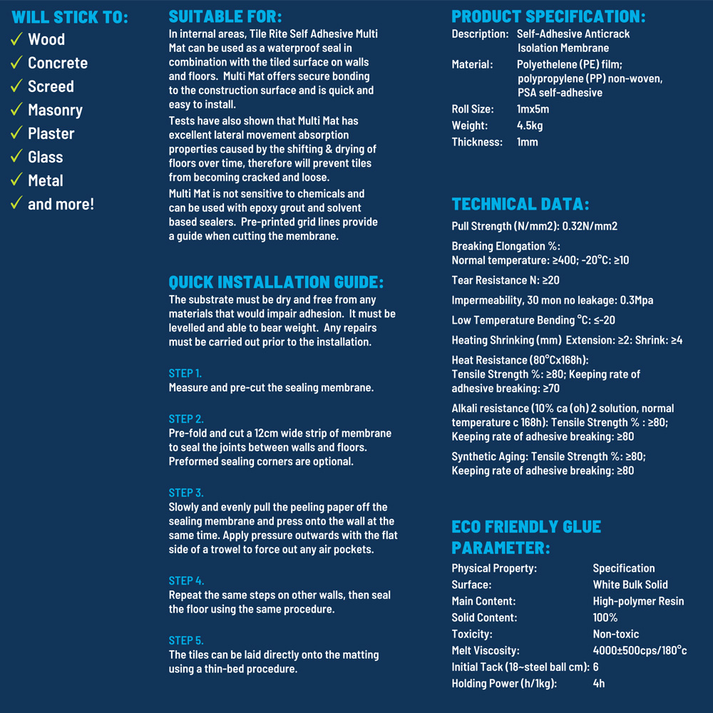 - No waiting or drying time! You are able to install tiles immediately once the matting is applied